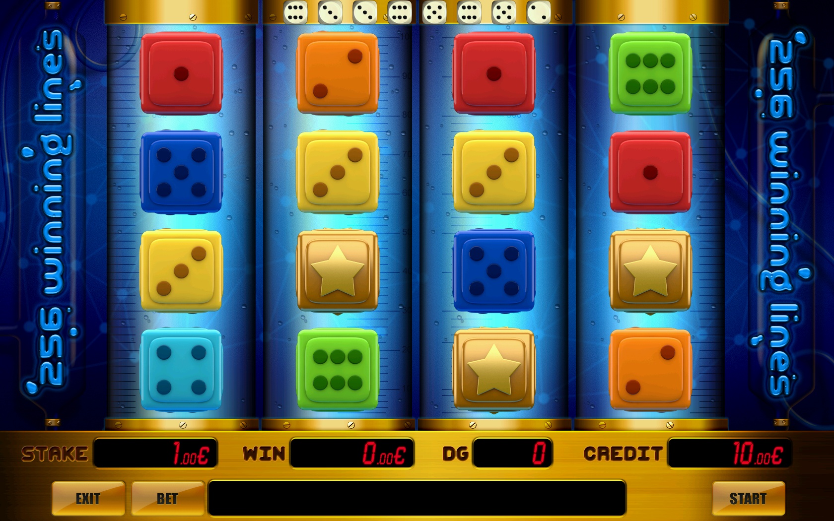 Multidice 81 is video game with 4 strips of 3 dice symbols which display the result of pre-game (upper row of 8 dices). The available stakes are at 81 winning lines. The player is awarded a prize for 3 or 4 matching symbols. Winnings are counted from left to right.