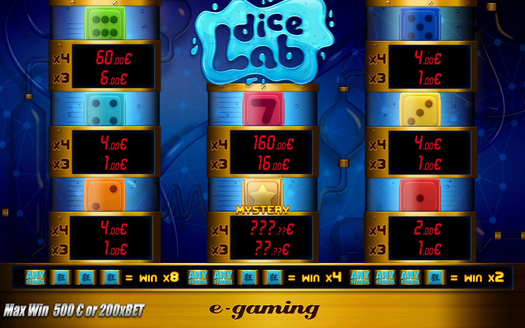 DICE LAB is video slot game with dice symbols with 4 strips, 4 rows and 256 winning lines. Game features six classic dice (no.1-6), two "symbol" dice (MYSTERY, SEVEN), one "Wild" dice symbol and an extra win multiplier.